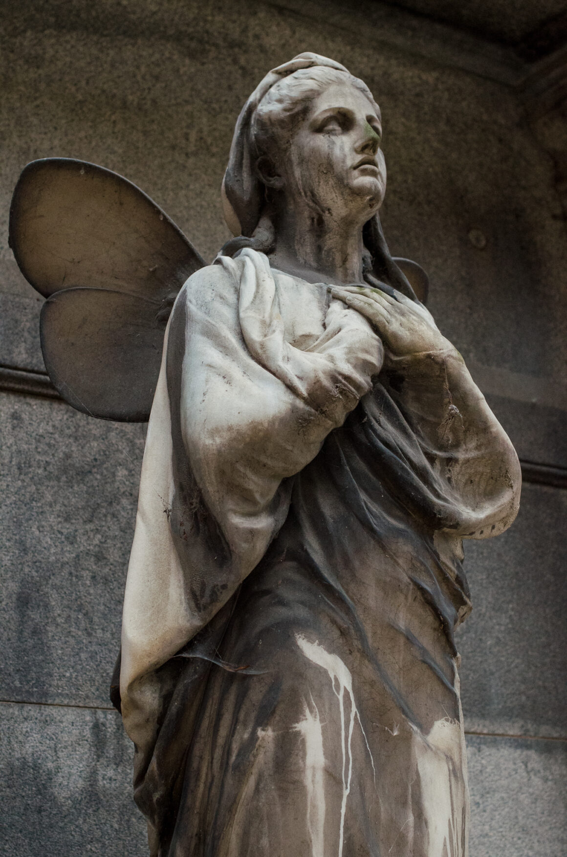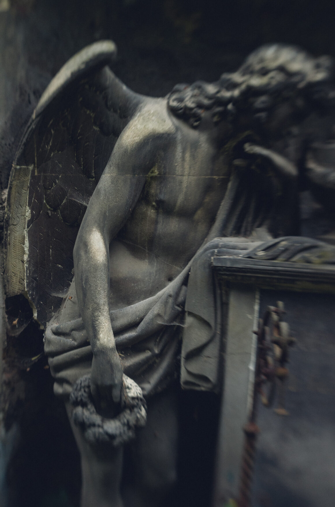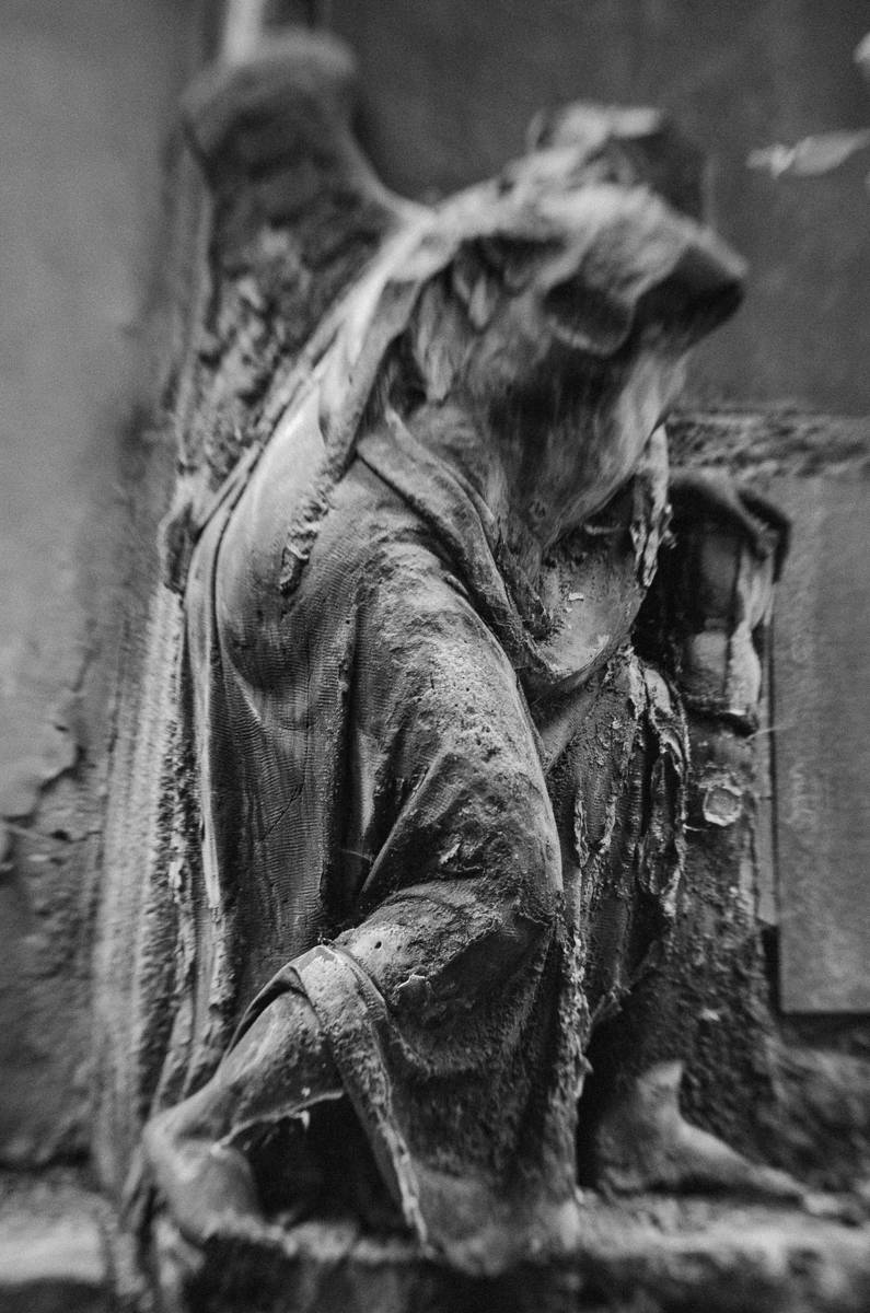 This part of Olšany felt like a liminal threshold. Overhead, the twisted branches of old trees wove themselves into high arches above abandoned tombs and stones swallowed by ivy and ferns. Underfoot, roots pressed upward through the earth, tightening around graves and iron fences, slowly shifting them out of place and upward. The stone angels, worn by time and weather, had lost their angularity; their softened features made them seem almost human.